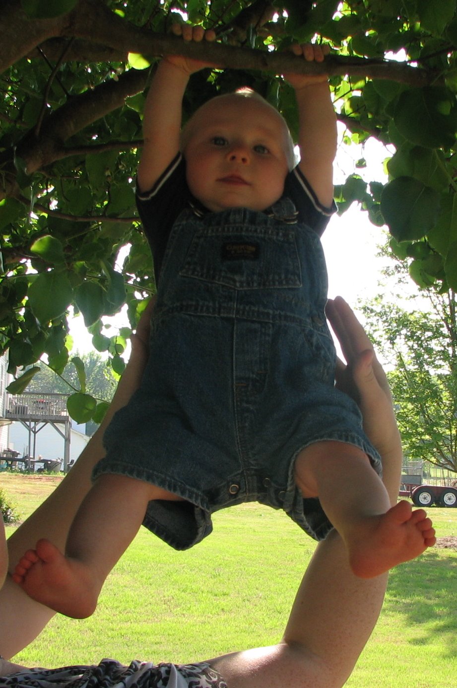 We were playing outside with Liliana and Carter over the weekend when Carter reached up for the tree. We decided to see how much arm strength he had-- He LOVED it... I let COMPLETELY go of him and he just laughed and laughed...Liliana wanted a turn too but wasn't quite sure of it all!